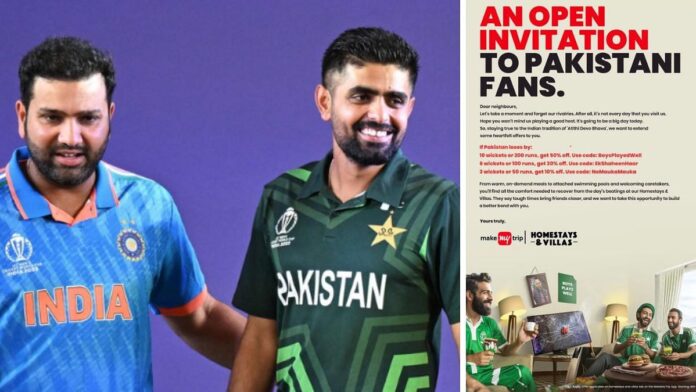 মহানগর ডেস্ক: মেক মাই ট্রিপ, একটি জনপ্রিয় ভ্রমণ ওয়েবসাইট। তবে সম্প্রতি এই ওয়েবসাইটের একটি বিজ্ঞাপন ইন্টারনেটে আলোড়ন ফেলে দিয়েছে, অনেকেই বিষয়টি নিয়ে চটেছেন। অসংবেদনশীল এবং বিরক্তিকর বলে মনে করেছে। আজ আমেদাবাদের নরেন্দ্র মোদী স্টেডিয়ামে আইসিসি ক্রিকেট বিশ্বকাপ ২০২৩-এর অত্যন্ত প্রত্যাশিত ভারত বনাম পাকিস্তান ম্যাচ। আর এই ম্যাচ সম্পর্কিত বিজ্ঞাপনটির প্রচার রীতিমতো বিতর্কের জন্ম দিয়েছে।